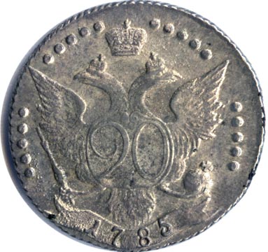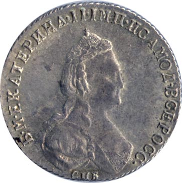 Выделяют два типа - «шея длиннее» и «шея короче». Лицевая сторона — портрет императрицы и надпись «Б М ЕКАТЕРИНА II IМП И САМОД ВСЕРОСС», оборотная — двуглавый орел, обозначение номинала цифрой и счетными точками и дата.