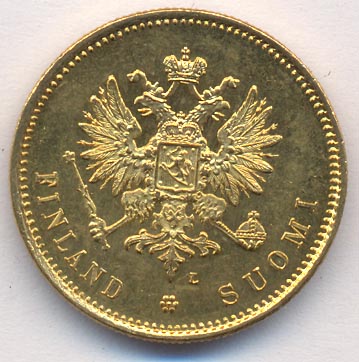 Лицевая сторона — российский двуглавый орел с гербом Великого княжества Финляндского на груди, оборотная — номинал и дата в кольцевой надписи с указанием содержания чистого золота и меди в граммах. Проба — 900, нормативный вес — 6,45 грамма, гурт ребристый.