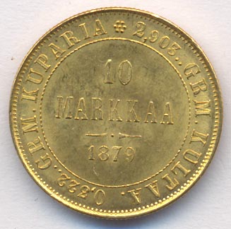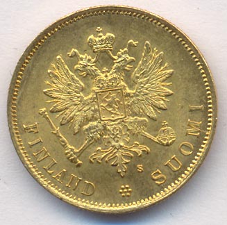 Лицевая сторона — российский двуглавый орел с гербом Великого княжества Финляндского на груди, оборотная — номинал и дата в кольцевой надписи с указанием содержания чистого золота и меди в граммах. Проба — 900, нормативный вес — 3,23 грамма, гурт ребристый.