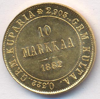 По содержанию металлов и стоимости марка составляет четверть от рубля. Чеканились монеты на вновь построенном монетном дворе в Гельсингфорсе (Хельсинки). В надписи на оборотной стороне золотых монет указано количество чистого золота и меди в граммах.