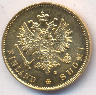 Лицевая сторона — российский двуглавый орел с гербом Великого княжества Финляндского на груди, оборотная — номинал и дата в кольцевой надписи с указанием содержания чистого золота и меди в граммах. Проба — 900, нормативный вес — 3,23 грамма, гурт ребристый.