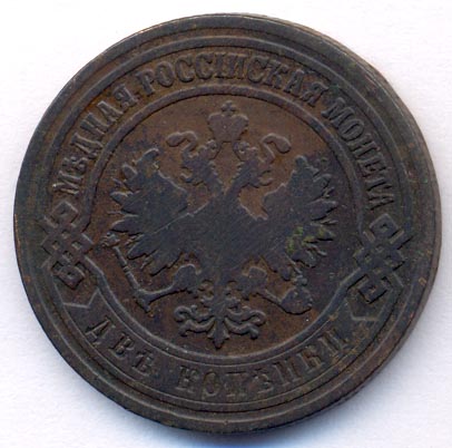 Лицевая сторона — двуглавый орел, надпись МЕДНАЯ РОССIЙСКАЯ МОНЕТА и обозначение номинала (две копейки); оборотная — обозначение номинала (2 копейки) в бусовом ободке и дата. Нормативный вес — 6,55 грамма, гурт рубчатый.