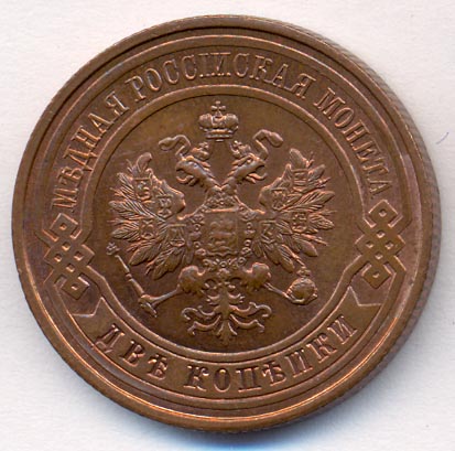 Лицевая сторона — двуглавый орел, надпись МЕДНАЯ РОССIЙСКАЯ МОНЕТА и обозначение номинала (две копейки); оборотная — обозначение номинала (2 копейки) в бусовом ободке и дата. Нормативный вес — 6,55 грамма, гурт рубчатый.