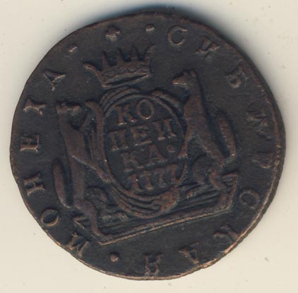 Лицевая сторона - два соболя поддерживают щит с обозначением номинала (копейка) под короной, надпись «СИБИРСКАЯ МОНЕТА». Оборотная — вензель Екатерины II в венке из пальмовой и лавровой ветвей. Гурт — шнур, вес — 6,55 грамма.