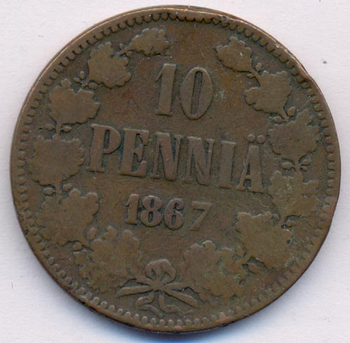 Лицевая сторона — вензель Александра II, оборотная — номинал (10 PENNIA) в венке из дубовых ветвей и дата. Нормативный вес — 12,80 грамма, гурт гладкий.