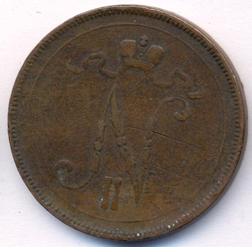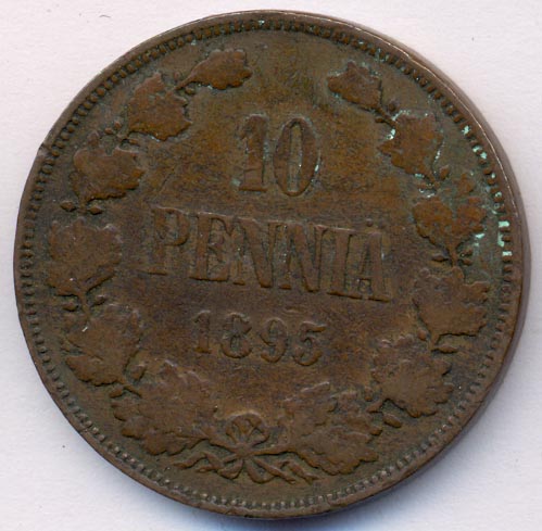 Лицевая сторона — вензель Александра II, оборотная — номинал (10 PENNIA) в венке из дубовых ветвей и дата. Нормативный вес — 12,80 грамма, гурт гладкий.