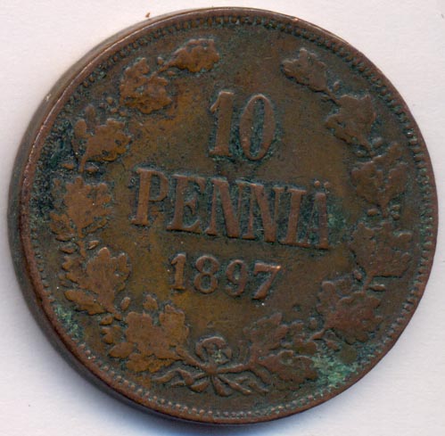 Лицевая сторона — вензель Александра II, оборотная — номинал (10 PENNIA) в венке из дубовых ветвей и дата. Нормативный вес — 12,80 грамма, гурт гладкий.