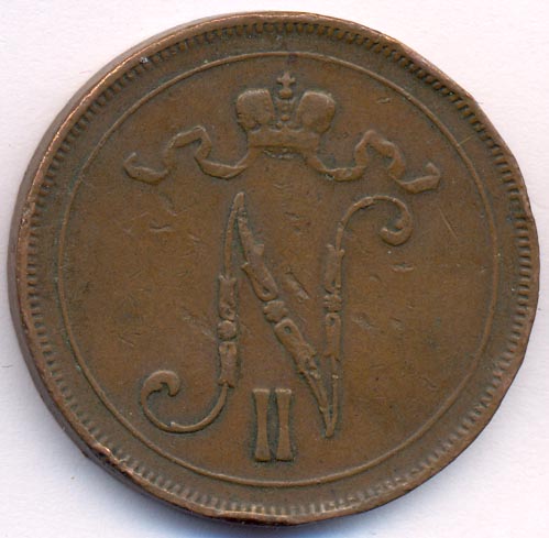 Лицевая сторона — вензель Александра II, оборотная — номинал (10 PENNIA) в венке из дубовых ветвей и дата. Нормативный вес — 12,80 грамма, гурт гладкий.