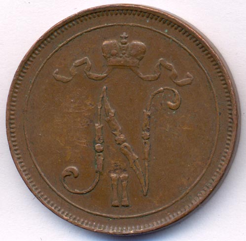 Лицевая сторона — вензель Александра II, оборотная — номинал (10 PENNIA) в венке из дубовых ветвей и дата. Нормативный вес — 12,80 грамма, гурт гладкий.