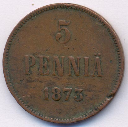 Лицевая сторона — вензель Александра II, оборотная — номинал (5 PENNIA) и дата. Нормативный вес — 6,40 грамма, гурт гладкий.
