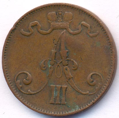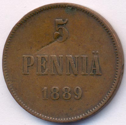 Лицевая сторона — вензель Александра II, оборотная — номинал (5 PENNIA) и дата. Нормативный вес — 6,40 грамма, гурт гладкий.