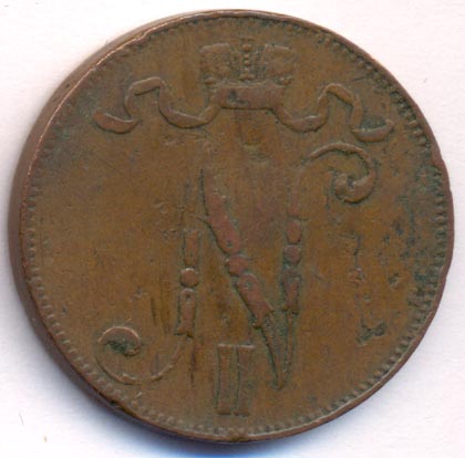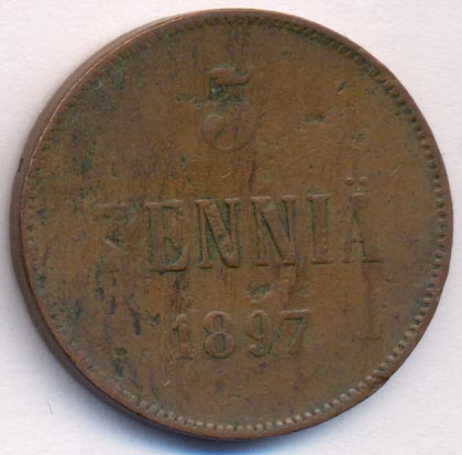 Лицевая сторона — вензель Александра II, оборотная — номинал (5 PENNIA) и дата. Нормативный вес — 6,40 грамма, гурт гладкий.