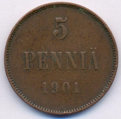 Лицевая сторона — вензель Александра II, оборотная — номинал (5 PENNIA) и дата. Нормативный вес — 6,40 грамма, гурт гладкий.
