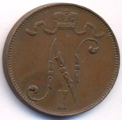 Лицевая сторона — вензель Александра II, оборотная — номинал (5 PENNIA) и дата. Нормативный вес — 6,40 грамма, гурт гладкий.