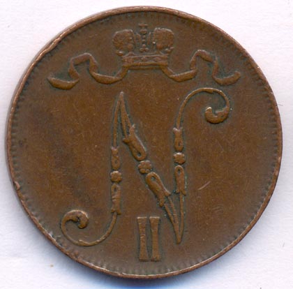 Лицевая сторона — вензель Александра II, оборотная — номинал (5 PENNIA) и дата. Нормативный вес — 6,40 грамма, гурт гладкий.