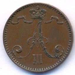 Лицевая сторона — вензель Александра II, оборотная — номинал (1 PENNIA) и дата. Нормативный вес — 1,28 грамма, гурт гладкий.
