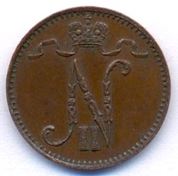 Лицевая сторона — вензель Александра II, оборотная — номинал (1 PENNIA) и дата. Нормативный вес — 1,28 грамма, гурт гладкий.