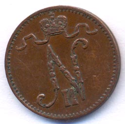 Лицевая сторона — вензель Александра II, оборотная — номинал (1 PENNIA) и дата. Нормативный вес — 1,28 грамма, гурт гладкий.