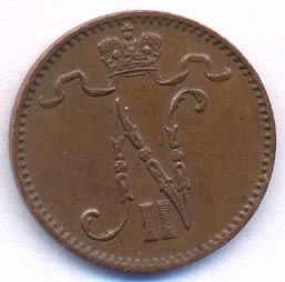 Лицевая сторона — вензель Александра II, оборотная — номинал (1 PENNIA) и дата. Нормативный вес — 1,28 грамма, гурт гладкий.