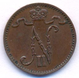 Лицевая сторона — вензель Александра II, оборотная — номинал (1 PENNIA) и дата. Нормативный вес — 1,28 грамма, гурт гладкий.