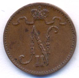 Лицевая сторона — вензель Александра II, оборотная — номинал (1 PENNIA) и дата. Нормативный вес — 1,28 грамма, гурт гладкий.