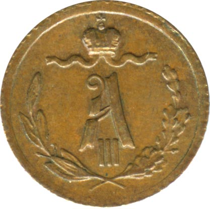 Указом от 21 марта 1867 года Александр II утверждает 50-рублевую стопу для медных монет. Новые монеты получают усложненное оформление, дополнительным отличием от прежних выпусков служит рубчатый гурт (чеканка ведется без предварительного гурчения кружков в неразъемном рубчатом кольце).
