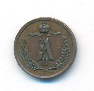 Лицевая сторона — вензель Александра II в венке из лавровой и дубовой ветвей; оборотная — обозначение номинала (1/4 копейки) и дата. Нормативный вес — 0,82 грамма, гурт рубчатый.