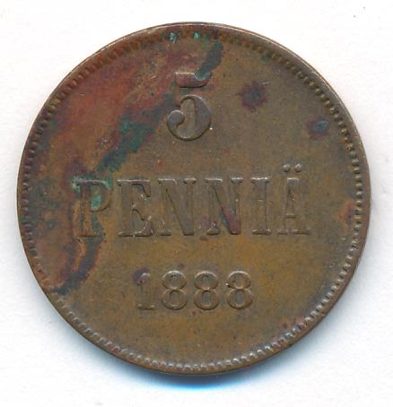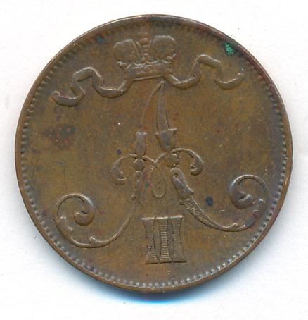 Лицевая сторона — вензель Александра II, оборотная — номинал (5 PENNIA) и дата. Нормативный вес — 6,40 грамма, гурт гладкий.