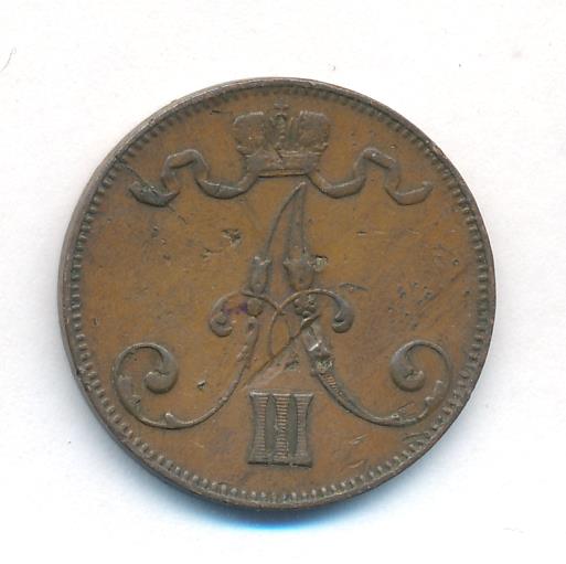 Лицевая сторона — вензель Александра II, оборотная — номинал (5 PENNIA) и дата. Нормативный вес — 6,40 грамма, гурт гладкий.