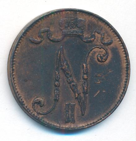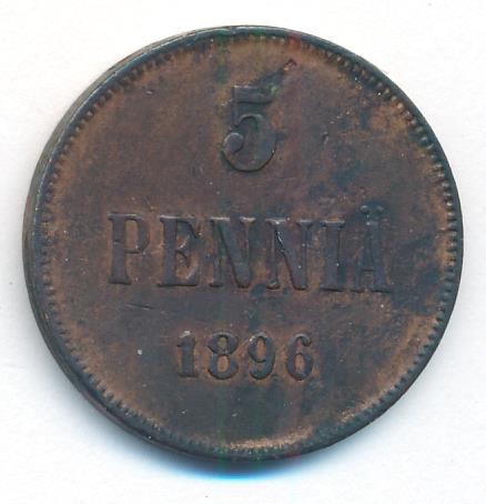 Лицевая сторона — вензель Александра II, оборотная — номинал (5 PENNIA) и дата. Нормативный вес — 6,40 грамма, гурт гладкий.