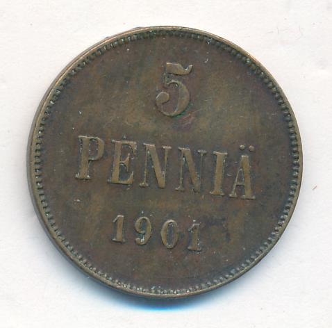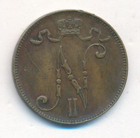 Лицевая сторона — вензель Александра II, оборотная — номинал (5 PENNIA) и дата. Нормативный вес — 6,40 грамма, гурт гладкий.