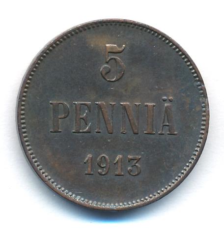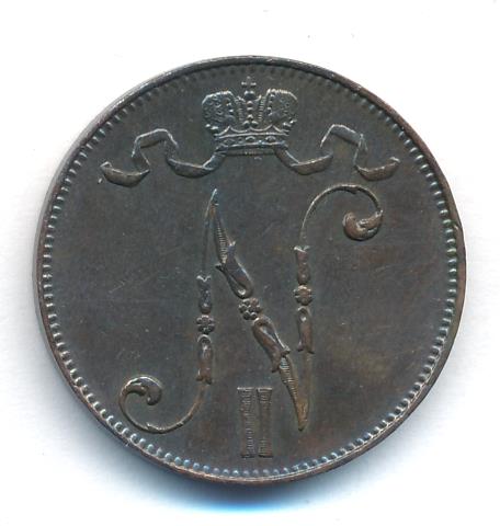 Лицевая сторона — вензель Александра II, оборотная — номинал (5 PENNIA) и дата. Нормативный вес — 6,40 грамма, гурт гладкий.