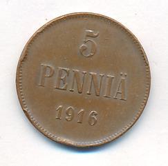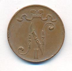 Лицевая сторона — вензель Александра II, оборотная — номинал (5 PENNIA) и дата. Нормативный вес — 6,40 грамма, гурт гладкий.
