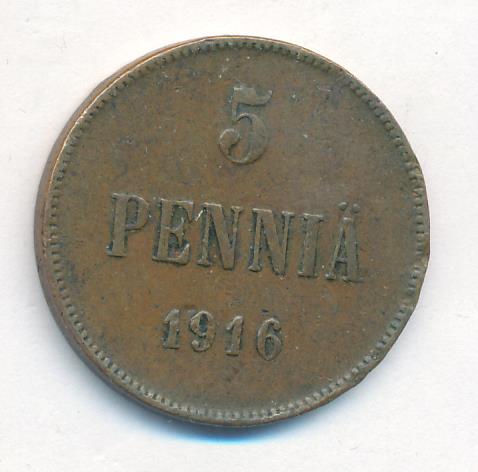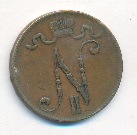 Лицевая сторона — вензель Александра II, оборотная — номинал (5 PENNIA) и дата. Нормативный вес — 6,40 грамма, гурт гладкий.