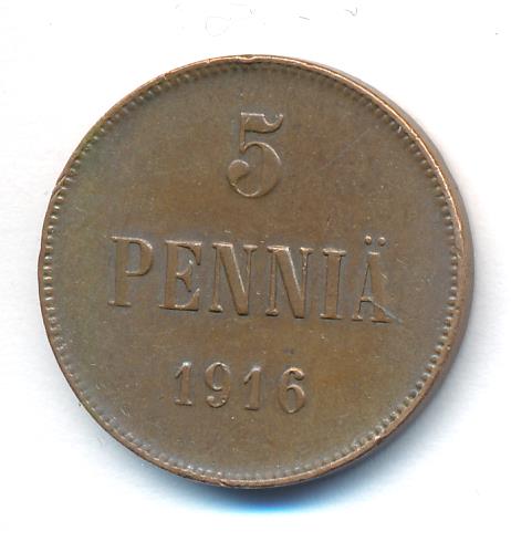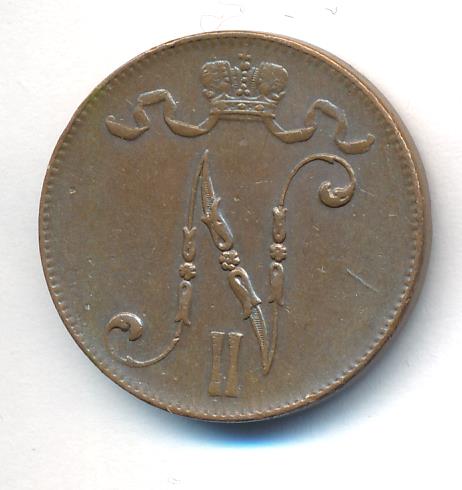 Лицевая сторона — вензель Александра II, оборотная — номинал (5 PENNIA) и дата. Нормативный вес — 6,40 грамма, гурт гладкий.