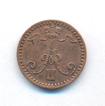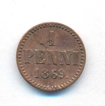 Лицевая сторона — вензель Александра II, оборотная — номинал (1 PENNIA) и дата. Нормативный вес — 1,28 грамма, гурт гладкий.