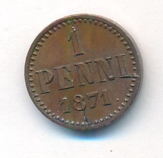 Лицевая сторона — вензель Александра II, оборотная — номинал (1 PENNIA) и дата. Нормативный вес — 1,28 грамма, гурт гладкий.