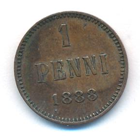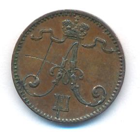 Лицевая сторона — вензель Александра II, оборотная — номинал (1 PENNIA) и дата. Нормативный вес — 1,28 грамма, гурт гладкий.