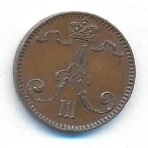 Лицевая сторона — вензель Александра II, оборотная — номинал (1 PENNIA) и дата. Нормативный вес — 1,28 грамма, гурт гладкий.