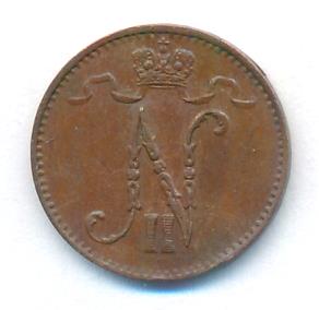 Лицевая сторона — вензель Александра II, оборотная — номинал (1 PENNIA) и дата. Нормативный вес — 1,28 грамма, гурт гладкий.