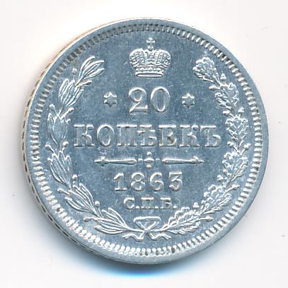 Лицевая сторона — гербовый орел, оборотная —обозначение номинала (20 копеекъ), окруженное венком из лавровой и дубовой ветвей и дата.