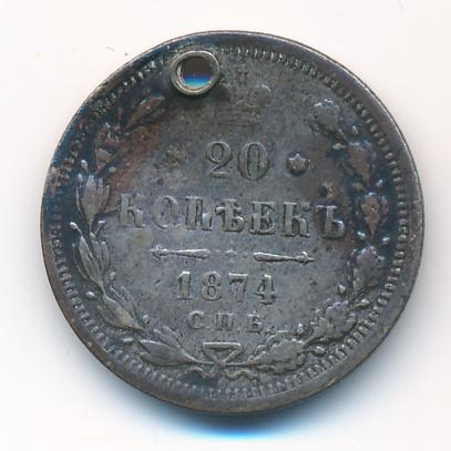 Лицевая сторона — гербовый орел, оборотная —обозначение номинала (20 копеекъ), окруженное венком из лавровой и дубовой ветвей и дата.