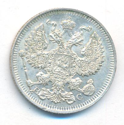 Лицевая сторона — гербовый орел, оборотная —обозначение номинала (20 копеекъ), окруженное венком из лавровой и дубовой ветвей и дата.
