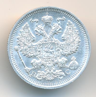 Лицевая сторона — гербовый орел, оборотная —обозначение номинала (20 копеекъ), окруженное венком из лавровой и дубовой ветвей и дата.