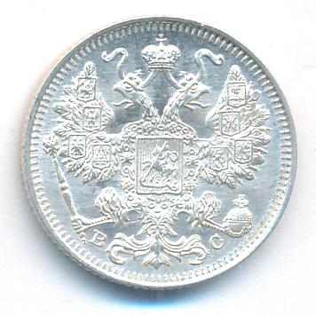 Лицевая сторона — гербовый орел, оборотная —обозначение номинала (15 копеекъ), окруженное венком из лавровой и дубовой ветвей и дата.