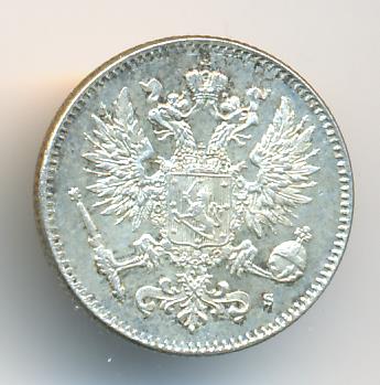 Лицевая сторона — российский двуглавый орел с гербом Великого княжества Финляндского на груди, оборотная — номинал и дата в венке из дубовых листьев. Проба — 750, нормативный вес — 2,55 грамма, гурт рубчатый.