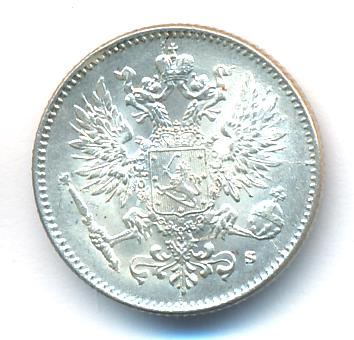 Лицевая сторона — российский двуглавый орел с гербом Великого княжества Финляндского на груди, оборотная — номинал и дата в венке из дубовых листьев. Проба — 750, нормативный вес — 2,55 грамма, гурт рубчатый.