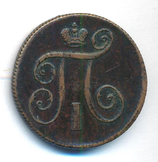 Лицевая сторона — вензель Павла I под короной, оборотная — номинал (1 копейка) и дата. Нормативный вес — 10,24 грамма, гурт — шнур.