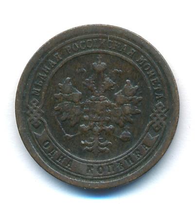 Лицевая сторона — двуглавый орел, надпись МЕДНАЯ РОССIЙСКАЯ МОНЕТА и обозначение номинала (одна копейка); оборотная — обозначение номинала (1 копейка) в бусовом ободке и дата. Нормативный вес — 3,28 грамма, гурт рубчатый.