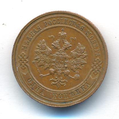 Лицевая сторона — двуглавый орел, надпись МЕДНАЯ РОССIЙСКАЯ МОНЕТА и обозначение номинала (одна копейка); оборотная — обозначение номинала (1 копейка) в бусовом ободке и дата. Нормативный вес — 3,28 грамма, гурт рубчатый.